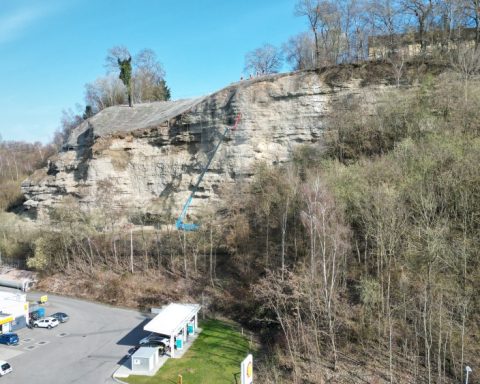 Fotos einer wichtigen Biberacher Baustelle. An der Ulmerstrasse oberhalb der Shell-Tankstelle wird der Hang abgesichert, damit nicht eines Tages tonnenschwere Felsen ungebremst nach unten krachen. Ein eindrucksvolles Unterfangen, bei dem zunächst eine