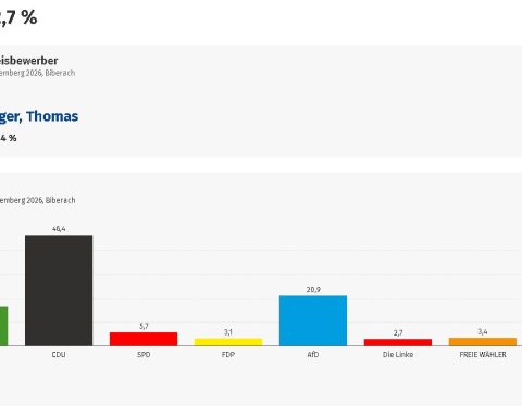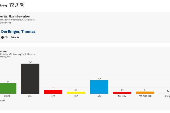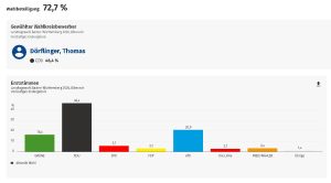 In der Stadt rund 69% Wahlbeteiligung. Bei den Erststimmen räumte CDU Mann Thomas Dörflinger ab, er bekam 38,2 % aller Wählerstimmen. Bei den Zweitstimmen gingen 34,6 % an die Grünen und rund