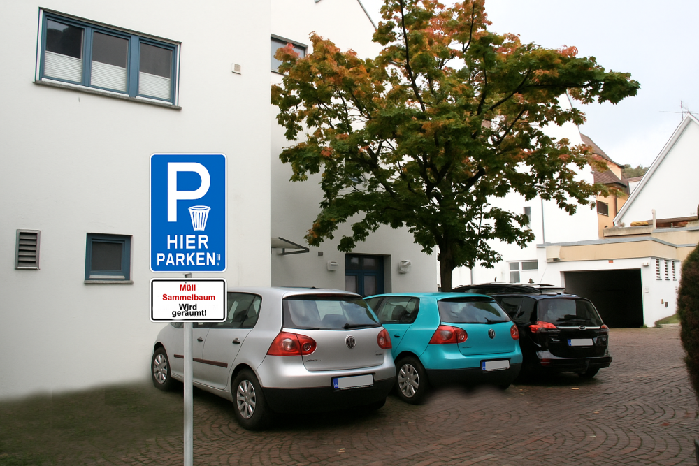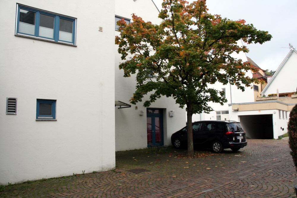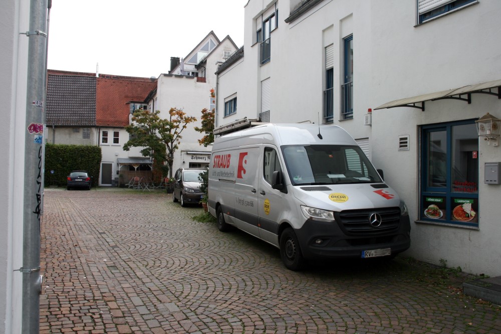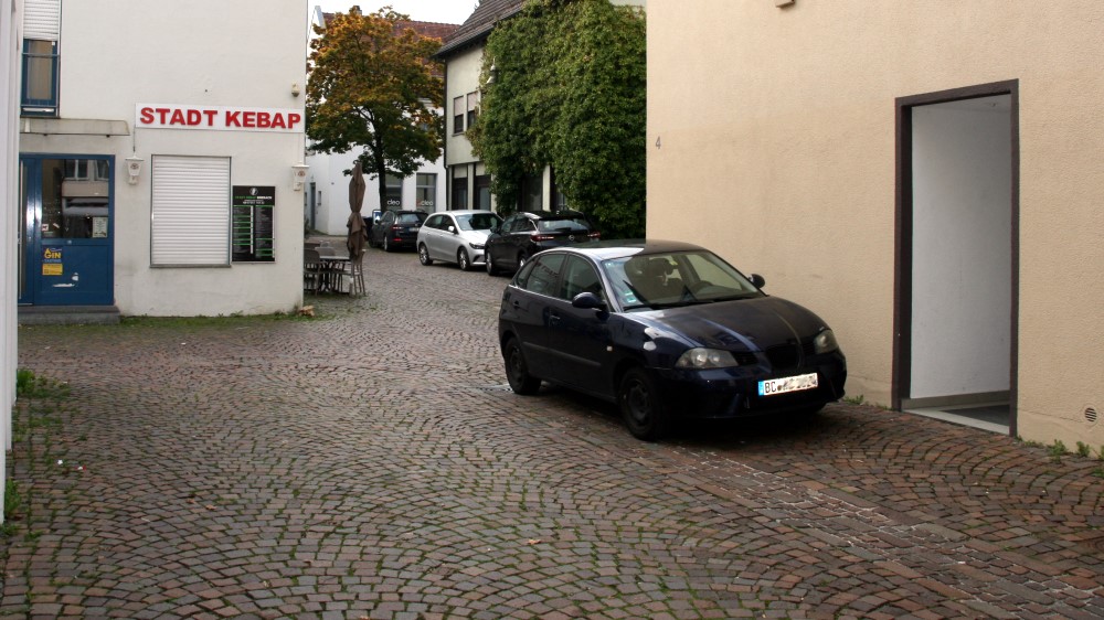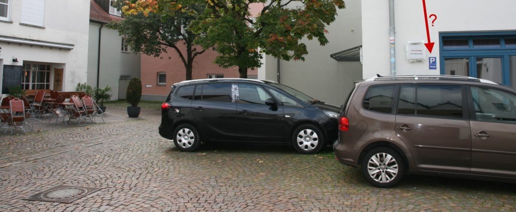 Zurück zur Sache: Parken Sie einfach direkt gegenüber von der Wirtschaft Schwarz Rössle rechts neben der Einfahrt zur Tiefgarage. Nein, dort finden sie keine Kennzeichnung von Parkbuchten, und ja dort sind Fahrradständer vorgesehen.