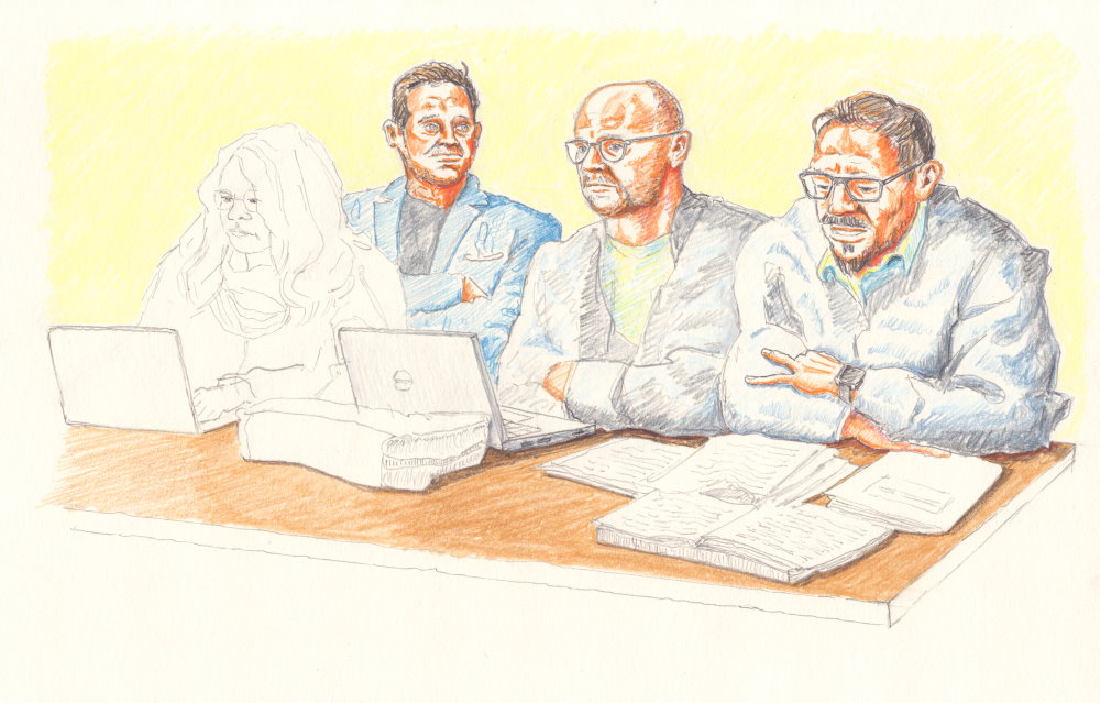 Protokollführerin, Angeklagter Daniel H., Heiko Weber (Verteidiger), Markus Lehmann (Verteidiger) von links nach rechts.