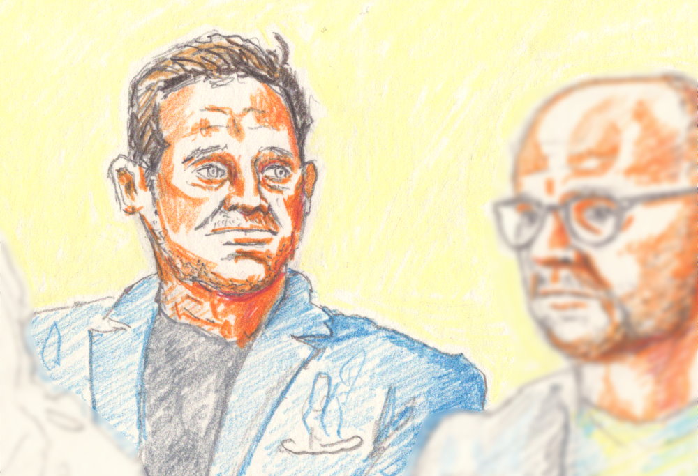 Daniel H. Angeklagt wegen mutmaßlichem Wurf eines bengalischen Feuers (Zeichnung, Albert Gratz)