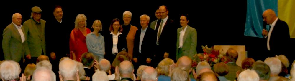 Relativ hoch ist inzwischen das Durchschnittsalter und das bemerkt man auch bei der Vergabe der Ehrungen für das Ehrenamt – sowohl beim Publikum, wie auch bei den Preisträgern. Außer dem Abdera und damit dem Verein Lilienthal bewegt sich die Gesellschaft deutlich in Richtung über 60. Auch bei den Zuschauern. Ob nun Bürger für Bürger, oder Bürgerstiftung oder auch die Agenda 21, insgesamt spürt man allenthalben, dass das Alter offenbar auch mehr Willen zur Hilfestellung mit sich bringt. Das an sich ist ja auch was Positives. Die Stadthalle mit Theaterfoyer war etwa zur Hälfte gefüllt, die Rede hielt erster Bürgermeister Miller, moderiert hat Johannes Riedel und OB Zeidler ließ sich – noch in der Erholungsphase nach Krankheit – entschuldigen. Hübsch und gerade richtig in der Länge, die Infofilme von Ecki Diehl über die vier geehrten Vereine.