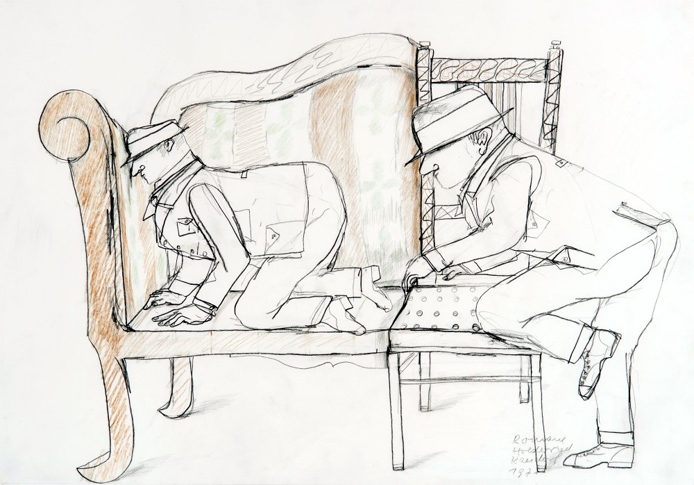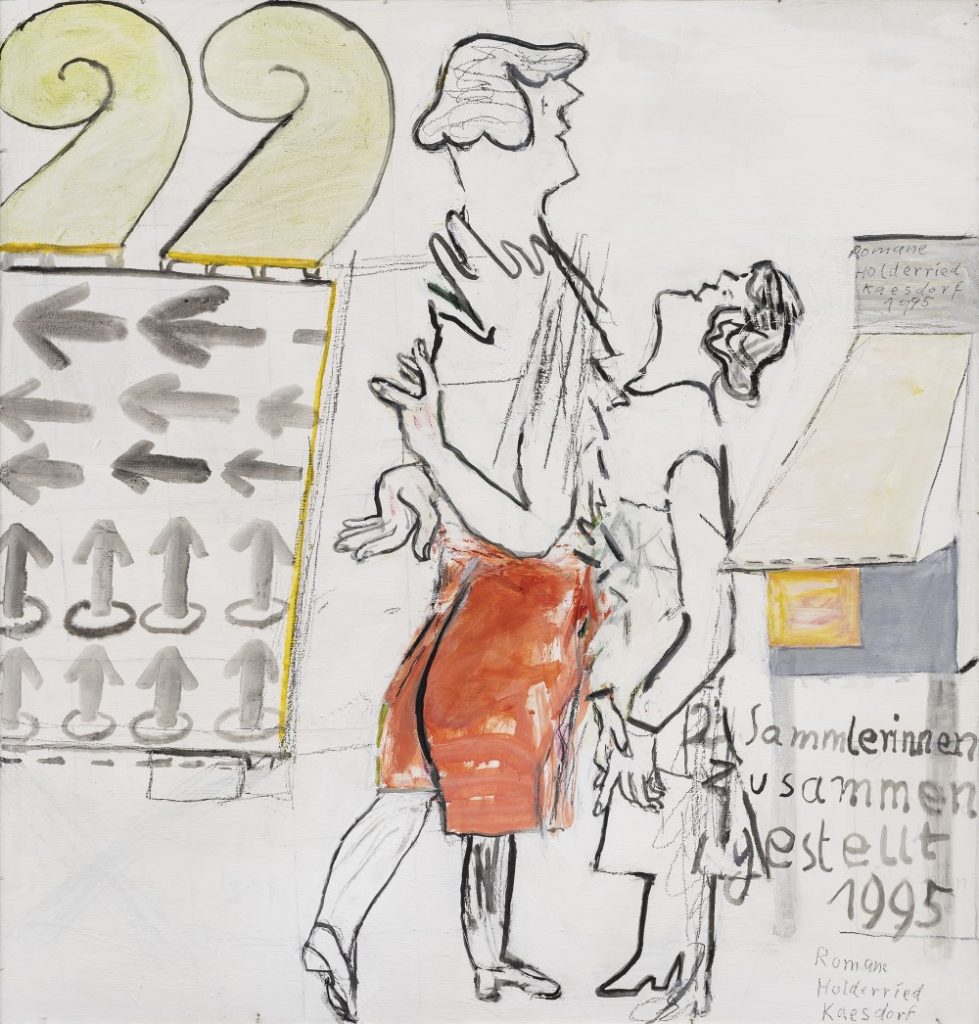 Haltung bewahren“, so lautet der Titel der Stuttgarter Ausstellung. Haltung zu bewahren, das versuchen auch immer die von Romane Holderried Kaesdorf gezeichneten Figuren. Mal müssen sie eine Jägerprüfung ablegen, eine Blumenvase auf dem Arm balancieren oder einen Stuhl platzieren. Ihr Werk war in Biberach nicht immer wohlgelitten. Der Humor und die versteckte Gesellschaftskritik in ihren Arbeiten kam bei vielen ihrer Zeitgenossen in Oberschwaben lange Zeit nicht gut an oder wurde nicht verstanden. Kunstexperten und fachlich versierte Kunstkritiker erkannten aber die herausragende Qualität ihrer großformatigen Zeichnungen sehr wohl. Zahlreiche überregionale Preise wurden ihr zuteil. 1992 wurde ihr ein Professorentitel durch das Land Baden-Württemberg verliehen.