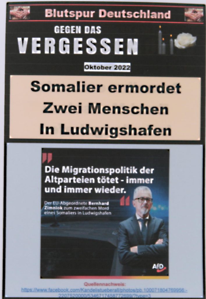 Der AfD Kreisverband hat für den Marktplatz am Freitag eine Sondernutzung beantragt, für einen Infostand. Die „Galerie der Blutspur“ stammt von Rentner Peter Ganz aus Augsburg und besteht eigentlich aus einigen Hundert laminierten DIN A4 Farbausdrucken die belegen sollen, dass letztlich Ausländer für Morde in Deutschland verantwortlich sind. Ketzerisch könnte man da sinnvoller Weise dagegenhalten, dass in der Mehrzahl Deutsche Deutsche umbringen und deshalb müsste man vielleicht die Deutschen des Landes verweisen.