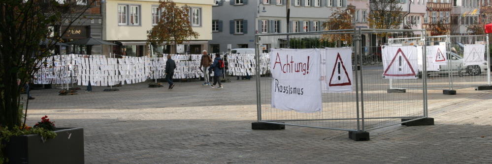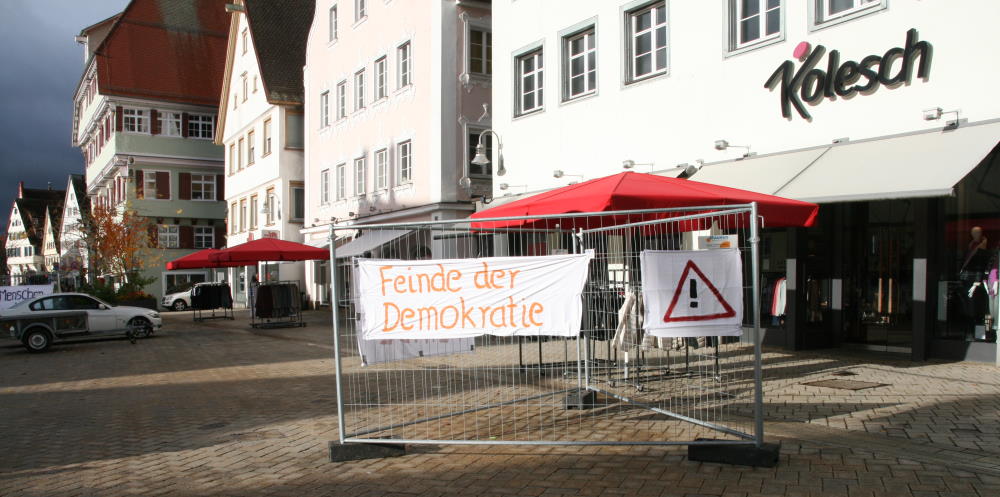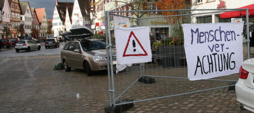 8:30 Uhr auf dem Biberacher Marktplatz: Ein paar wenige Friedensbewegte, Menschen aus dem Umfeld der SPD und von Jugend aktiv bringen selbst gemalte Banner an Gitterabsperrungen an. Sie verweisen auf die Veranstaltung die hier ab 10 Uhr stattfindet und warnen vor Hetze und Rassismus.