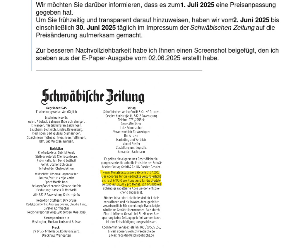 Die Ankündigung der Preiserhöhung im Impressum der schwäz war natürlich NICHT farblich gekennzeichnet.