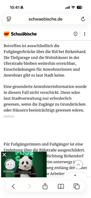 Seit die Fußgängerbrücke die Riss bei BIRKENHARD überquert ist das Leben in BIRKENDORF deutlich ruhiger geworden. Die Betroffenheit ist in beiden Orten groß. Oder hoch. Leser T.F. aus Biberach (oder war es Laupheim?) fragt was das Lektorat der SchwäZ eigentlich macht. Radio Eriwan antwortet: Fragen Sie ChatGPT!