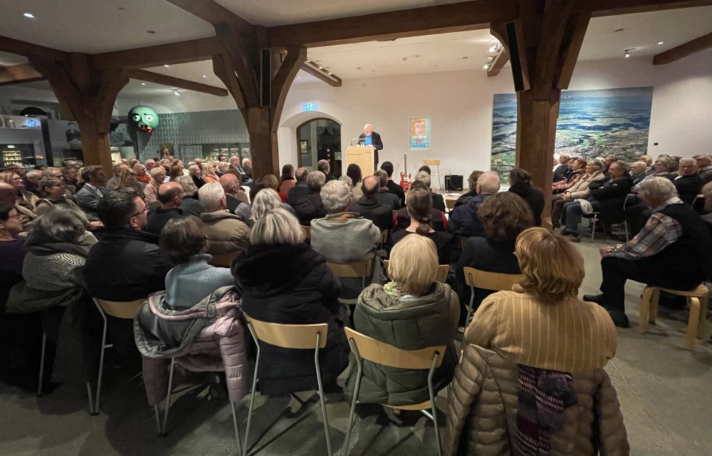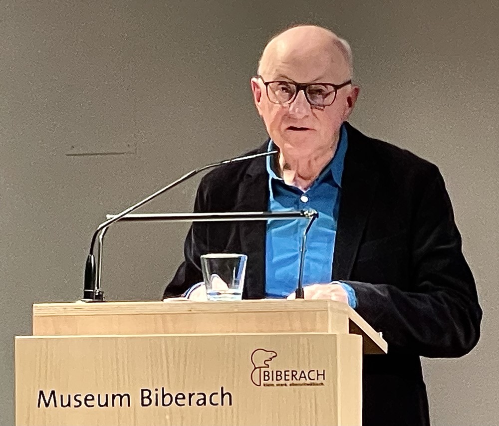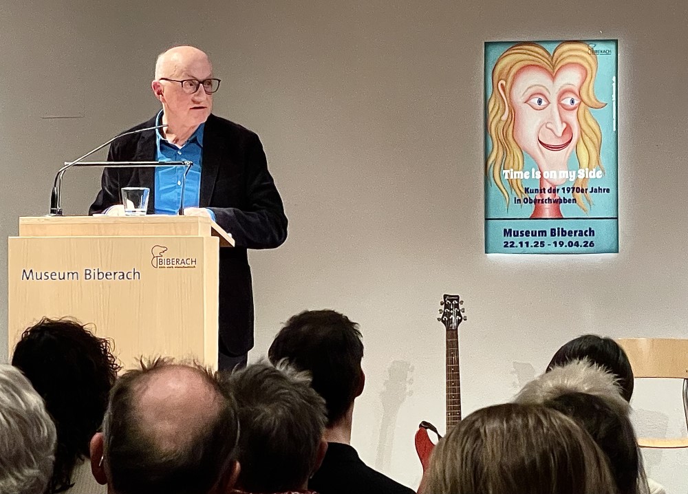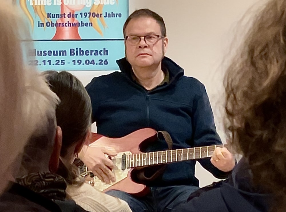 Nein Hape (Kerkeling) war nicht zu Gast im Biberacher Museum. Aber Jörg Mandernach. Der hat an der Aka in Stuttgart studiert, zeitweise parallel zu einem unserer Weberberg Mitstreiter. Zur Eröffnung der Ausstellung „Time is on my side“ – gestaltet von Dr. Uwe Degreif – improvisierte Mandernach auf der Gitarre zwischen den Eröffnungsreden von Museumsleiter Frank Brunecker, Kulturbürgermeisterin verena Fürgut und letztlich – natürlich – Dr. Uwe Degreif.
