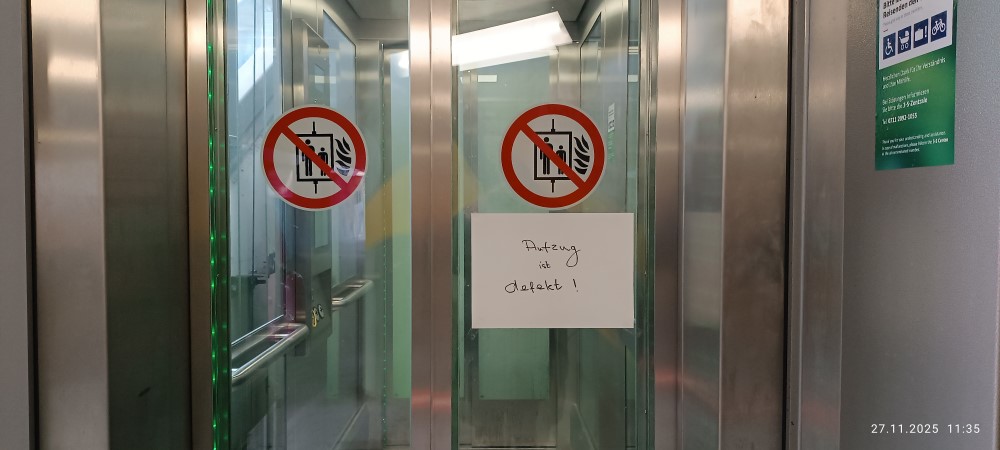 Kaum zu glauben, aber der stadtseitige Aufzug am Bahnhof ist seit einigen Tagen außer Betrieb. Allen Rollstuhlfahrern, Rollatoren-Nutzern, Kinderwagenschiebern und ähnlichen Mühseligen und Beladenen bleibt wenigstens der zynische Ratschlag erspart, es solle der nächste Bahnhof angefahren werden, der eine Gleisquerung erlaubt.