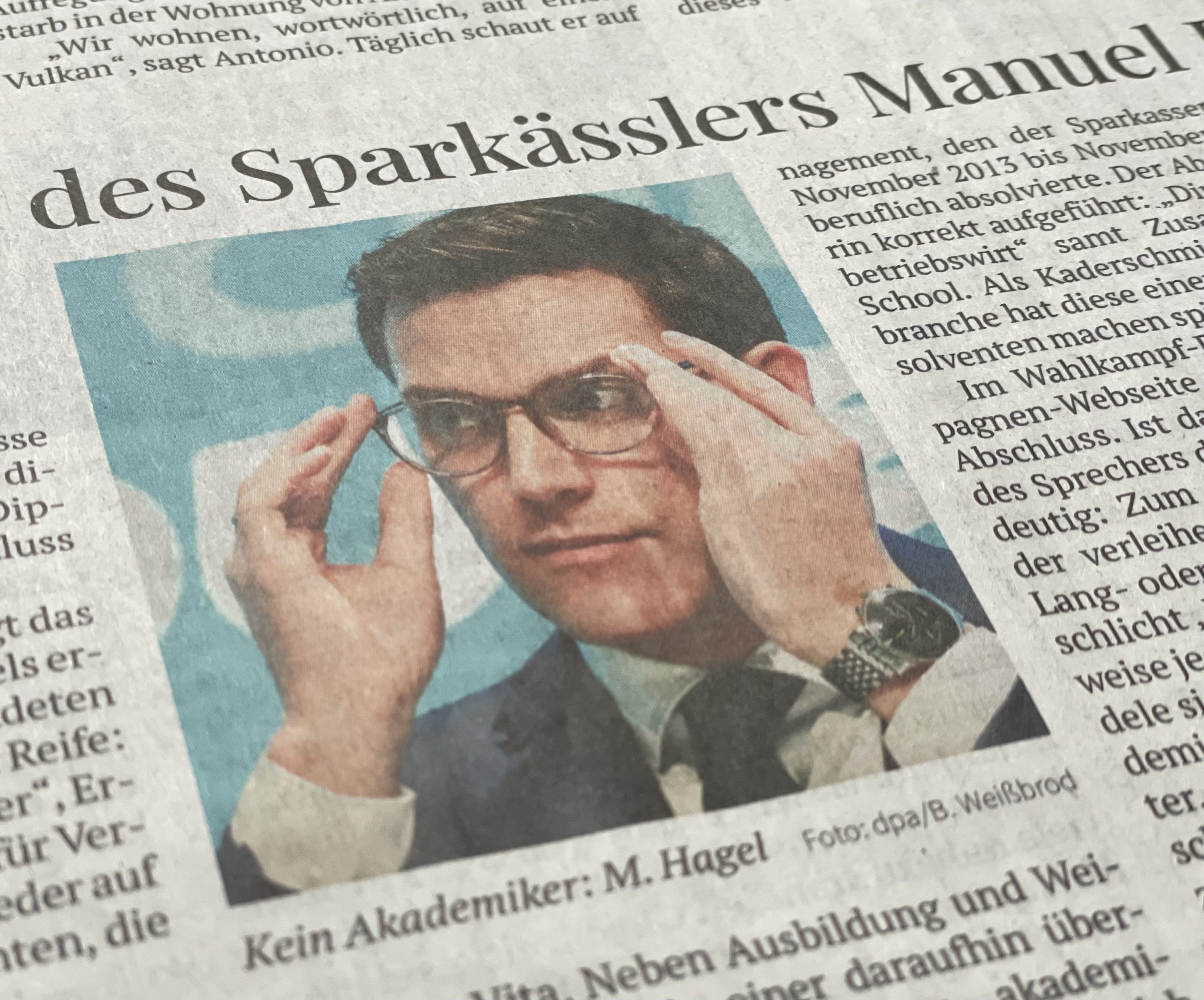 Aber, Hagel nimmt es mit seinem Lebenslauf offenbar laut Stuttgarter Zeitung nicht ganz so genau. Er nennt sich diplomierter Bankbetriebswirt. Das hört sich nach einem akademischen Abschluss an. Ist es aber nicht. Hagel hat kein Studium abgeschlossen. Die Stuttgarter Zeitung hat recherchiert und berichtete am Dienstag, 09.12., mit der süffisantes Überschrift: Das ganz spezielle „Diplom“ des Sparkässlers Manuel Hagel, wobei Diplom hier auch im Original in Anführungszeichen gesetzt wurde.