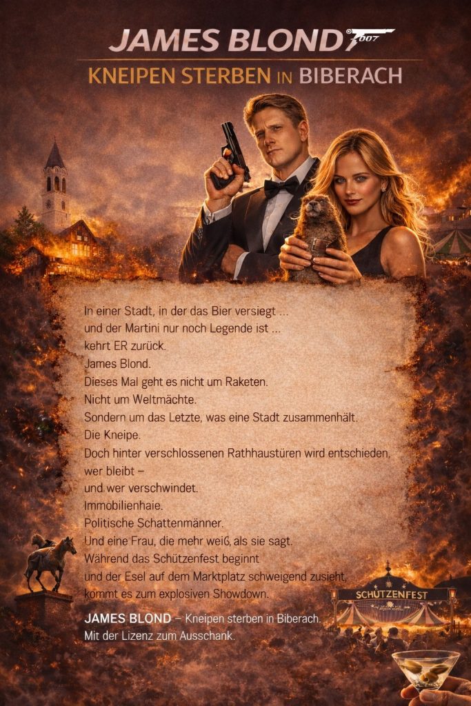 Als James Blond unfreiwillig in der oberschwäbischen Metropole Biberach strandet, glaubt er zunächst an einen administrativen Irrtum. Sein Auftrag wirkt lächerlich banal – fast beleidigend: