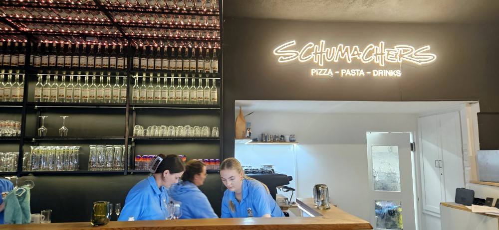 Das Ergebnis dieser ungewöhnlich aufwendigen Bemühungen ist eine bekömmliche, saftige und besonders wohlschmeckende neapolitanische Pizza. Dünner, saftiger Boden und krosser Rand sind die wichtigsten Merkmale. Die Nudeln im Schumachers werden ebenfalls aus eigenen Teigmischungen vor Ort hergestellt. Begleitet von wenigen, ausgewählten Soßen stehen außergewöhnliche Pastagerichte auf der Karte. Der Besuch lohnt sich, auch wegen des Ambientes und der gemütlichen Möblierung.