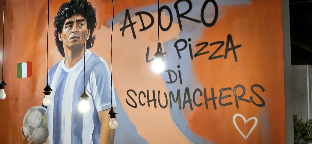 Das Ergebnis dieser ungewöhnlich aufwendigen Bemühungen ist eine bekömmliche, saftige und besonders wohlschmeckende neapolitanische Pizza. Dünner, saftiger Boden und krosser Rand sind die wichtigsten Merkmale. Die Nudeln im Schumachers werden ebenfalls aus eigenen Teigmischungen vor Ort hergestellt. Begleitet von wenigen, ausgewählten Soßen stehen außergewöhnliche Pastagerichte auf der Karte. Der Besuch lohnt sich, auch wegen des Ambientes und der gemütlichen Möblierung.