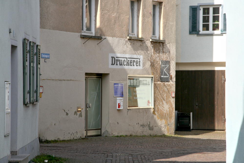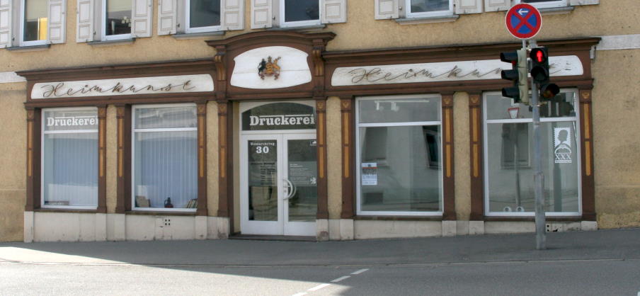 Früher war hier ein Einrichtungsgeschäft, aus der Zeit stammt noch der Schriftzug Heimkunst, dann folgte ein Teppichladen und nun hat die Druckerei Werner hier Unterschlupf gefunden. Zum Glück. Das stand schon ziemlich Spitz auf Kopf – aus der alten Location hatte man die letzte „echte“ Druckerei im old style in Biberach mehr oder minder vertrieben. Der Hausbesitzer plant (weniger) erfrischend Neues. Man könnte hier wahrscheinlich von ergebnisorientierter Optimierung sprechen.