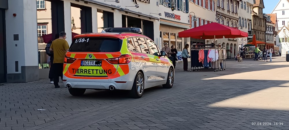Gestern (Mittwoch) auf dem Marktplatz am späteren Nachmittag. In stiller Anfahrt befährt die „Tierrettung“ den Marktplatz und parkt wie abgebildet. Ein veterinärmedizinischer Notfall? Sind vergiftete Ratten zu versorgen, überfressenen Tauben der Magen auszupumpen, an Höhenkrankheit leidende Esel zu stabilisieren, Kleidermotten vor Verfolgung zu bewahren? Ist ein abgestürzter Storch zu bergen oder gar ein eingeklemmter Biber aus dem Stadtbachrechen zu befreien? Nichts dergleichen. Die dreiköpfige Besatzung einsteigt in aller Ruhe dem Fahrzeug und… – legt eine Zigarettenpause ein. Nach geschätzten 10 Minuten wird wieder aufgesessen und der Marktplatz in Schritttempo Richtung Klohäusle verlassen, das interessierte Publikum ratlos zurücklassend. Ein Blick auf den einschlägigen Internetauftritt erklärt den Vorgang auch nicht