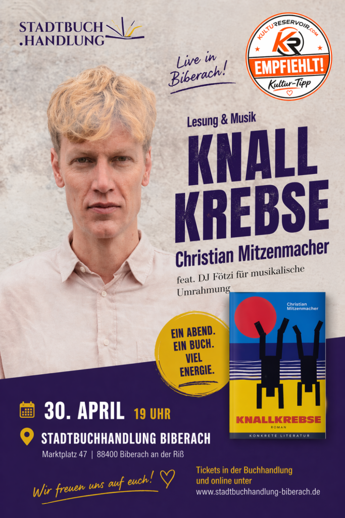 Christian Mitzenmacher liest aus seinem erfolgreichen Debüt-Roman „𝗞𝗻𝗮𝗹𝗹𝗸𝗿𝗲𝗯𝘀𝗲“ und entführt Sie in eine skurrile, witzige und tiefgründige Geschichte über Freundschaft, Vertrauen und die Absurditäten des Lebens. Im Anschluss laden wir herzlich zum Gespräch und zur Diskussion mit dem Autor ein. Dazu gibt es musikalische Begleitung.