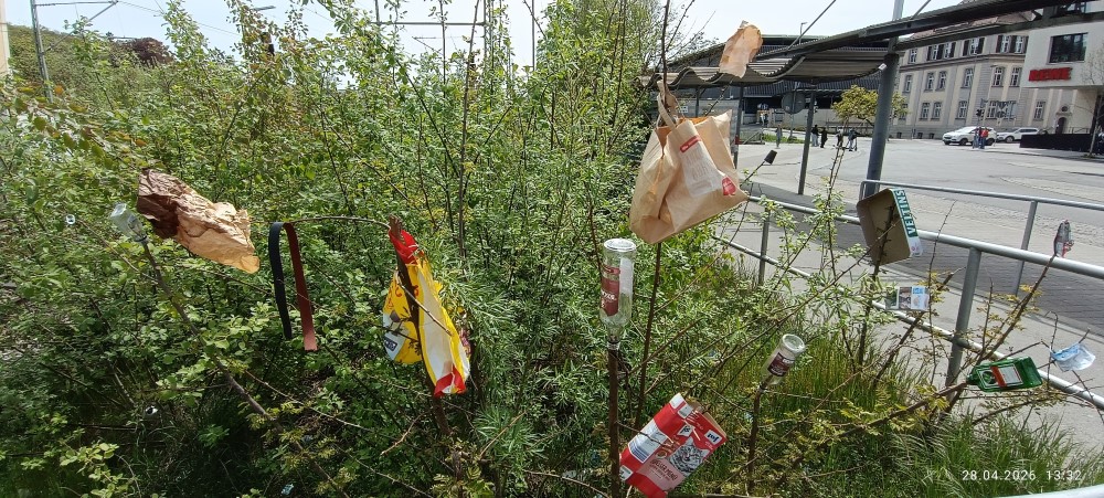 Da am Vortag (sprich gestern) die Strecke Biberach – Ulm durch eine defekte Weiche in Erbach ca 70 Minuten blockiert war, bestand die Möglichkeit, die bereits am Montag vorgestellte Situation (Fliegender Müll im Baum) am Biberacher Bahnhof intensiv zu betrachten. Wahrscheinlich handelt es sich nicht um eine innovative Form der Müllentsorgung. Gerüchteweise handelt es sich vielmehr um eine Open Air Popup Installation einer Künstlergruppe (Notname „Steig 19“), die sich das Bahnhofsareal zur Wirkstätte ausgeschaut hat. Vermutete Mitglieder von Steig 19 reagierten auf Anfrage, freundlich formuliert, unwirsch. Gelegentliche Happenings, auch unter Beteiligung der Blaulichtfamilie, wurden nicht bestätigt.